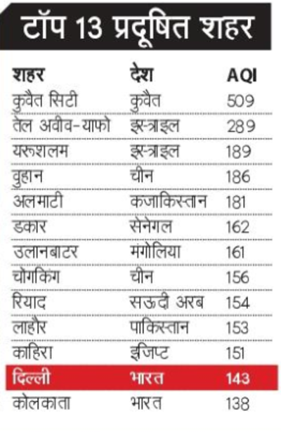 आईक्यूएयर की रिपोर्ट के मुताबिक 15 फरवरी को शाम 4 से 5 बजे के बीच राजधानी दिल्ली का एक्यूआई 143 दर्ज किया गया,ये खराब श्रेणी में आता है।हालांकि यह स्तर स्वास्थ्य के लिए अच्छा नहीं है,लेकिन विश्व के कई अन्य शहरों के मुकाबले बेहतर माना जा रहा है।इस रैंकिंग के मुताबिक अब कुवैत सिटी विश्व का सबसे प्रदूषित शहर है,जहां एक्यूआई 509 तक पहुंचा हुआ था।