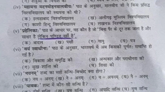 कक्षा सात की संस्कृत विषय की परीक्षा में खंड एक के बहुविकल्पीय प्रश्न संख्या-पांच में प्रहेलिका : पाठ के आधार पर वह कौन है जो बिना पैर के दूर तक जाता है और साक्षर है लेकिन पंडित नहीं है।आगरा की यह खबर प्रकाशित होने और सोशल मीडिया पर सवाल को वायरल किए जाने के बाद आखिरकार शिक्षा विभाग हरकत में आ गया है।उसने ऐसा विवादित सवाल बनाने पर डायट आगरा के प्राचार्य को निर्देश दिए कि प्रश्न पत्र बनाने वाले प्रवक्ता से इस प्रश्न पर स्पष्टीकरण मांगा जाए और फिर आगे कार्रवाई की जाए।