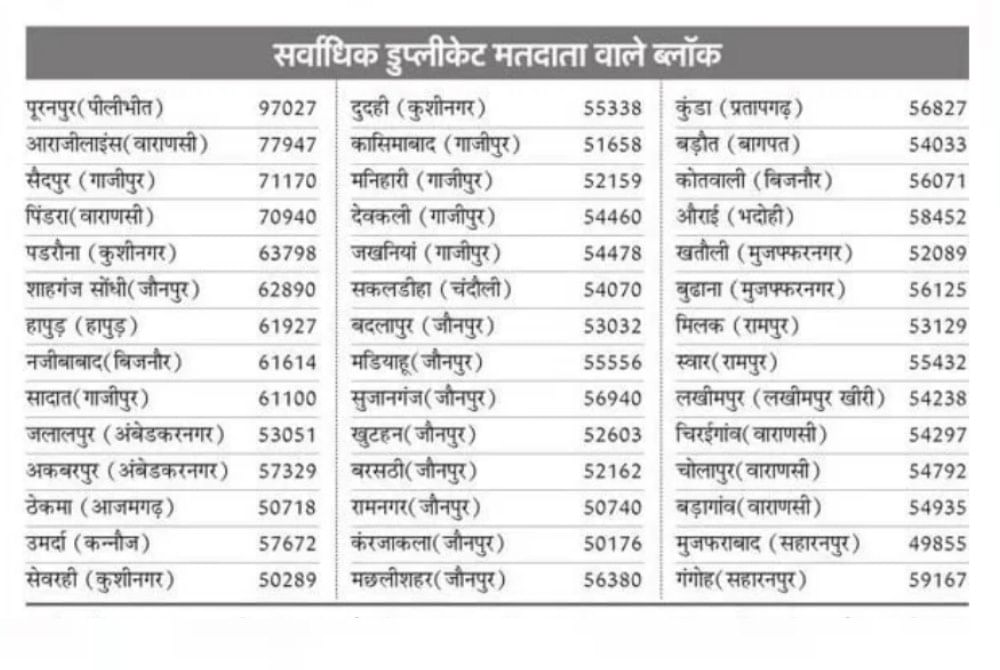 ऐसे ही स्थिति वाराणसी के आराजीलाइंस और पिंडरा, गाजीपुर के सैदपुर और सादात,जौनपुर के शाहगंज सोंधी, बिजनौर के नजीबाबाद और हापुड़ के हापुड़ विकास खंडों में मिली है। यह स्थिति त्रिस्तरीय पंचायत चुनाव की मतदाता सूचियों में मिली है।