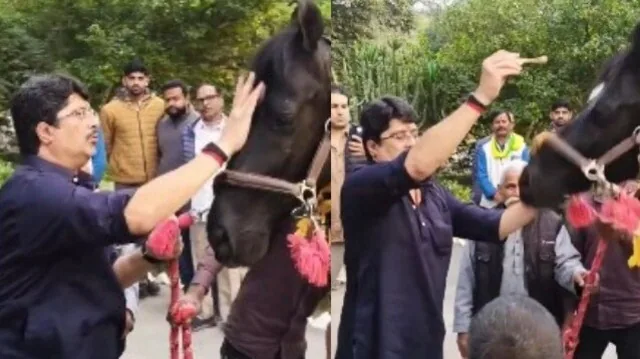 सोशल मीडिया वायरल हो रहे वीडियो में राजा भइया घोड़े का स्वागत तिलक लगाकर करते दिख रहे हैं।घोड़े की आरती उतारकर और नारियल फोड़कर अस्तबल में प्रवेश कराया गया।भारतीय राज परिवारों में घोड़े को ऐसे ही राजसी सेना का हिस्सा बनाया जाता था।